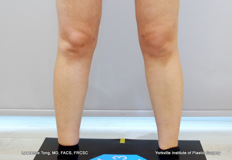 This patient in her mid 30's underwent liposuction to the lateral thighs, medial thighs, anterior thighs, medial knees, and calves. The results are shown approximately 6 weeks after surgery.